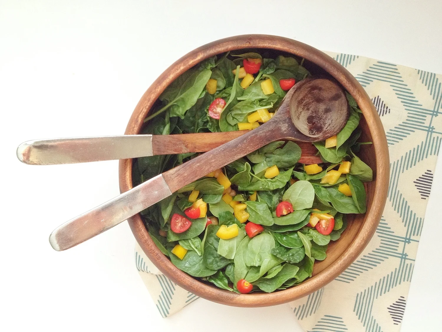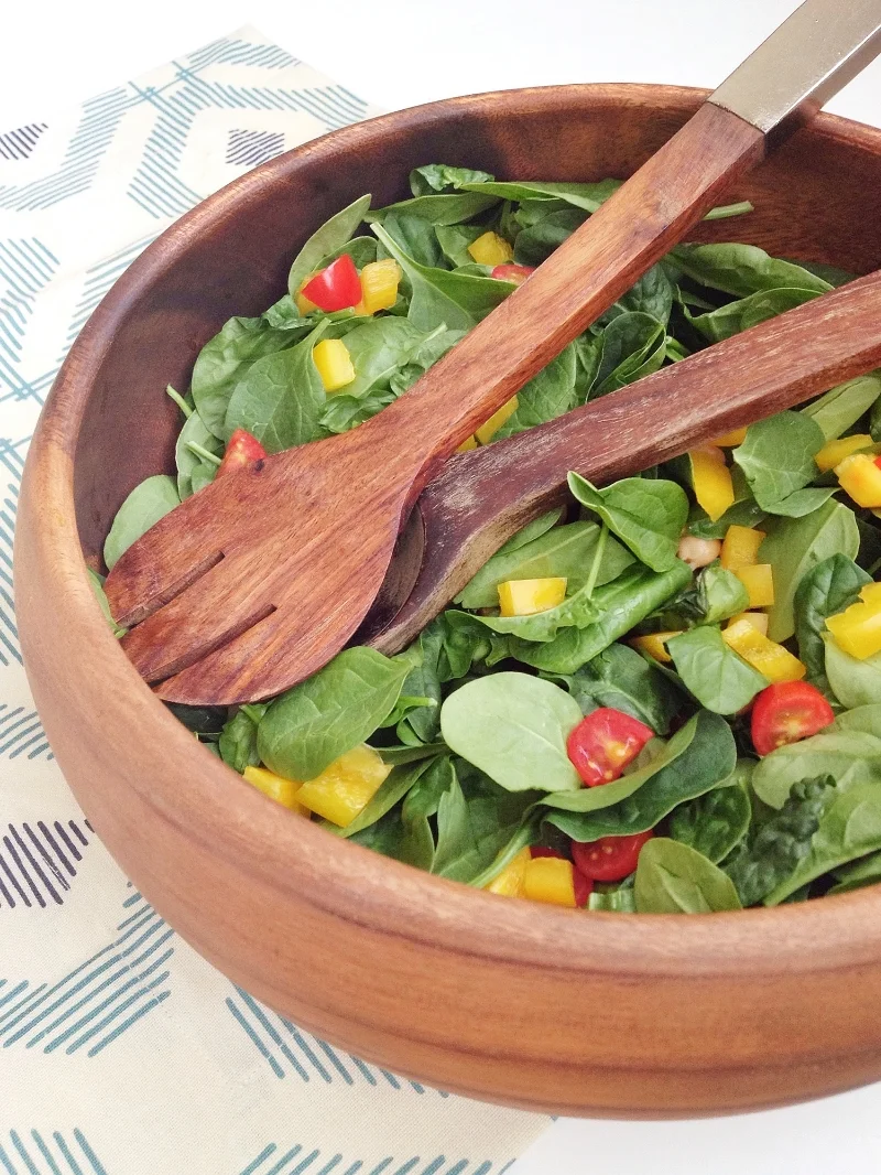The salad I am sharing with you today is made up of spinach, diced cherry tomato, diced yellow pepper, garbanzo beans, and pepitas (pumpkin seeds), then topped with a deliciously creamy dressing bursting with flavor. By the way, since we were just taking about greens, I should mention that spinach is one of the most nutrient dense foods on the planet! It is loaded with vitamin C, beta carotein, lutein, and zeaxanthin, which helps maintain healthy eyes, hair, and skin. The iron and B vitamins in spinach also help maintain a healthy circulatory system.