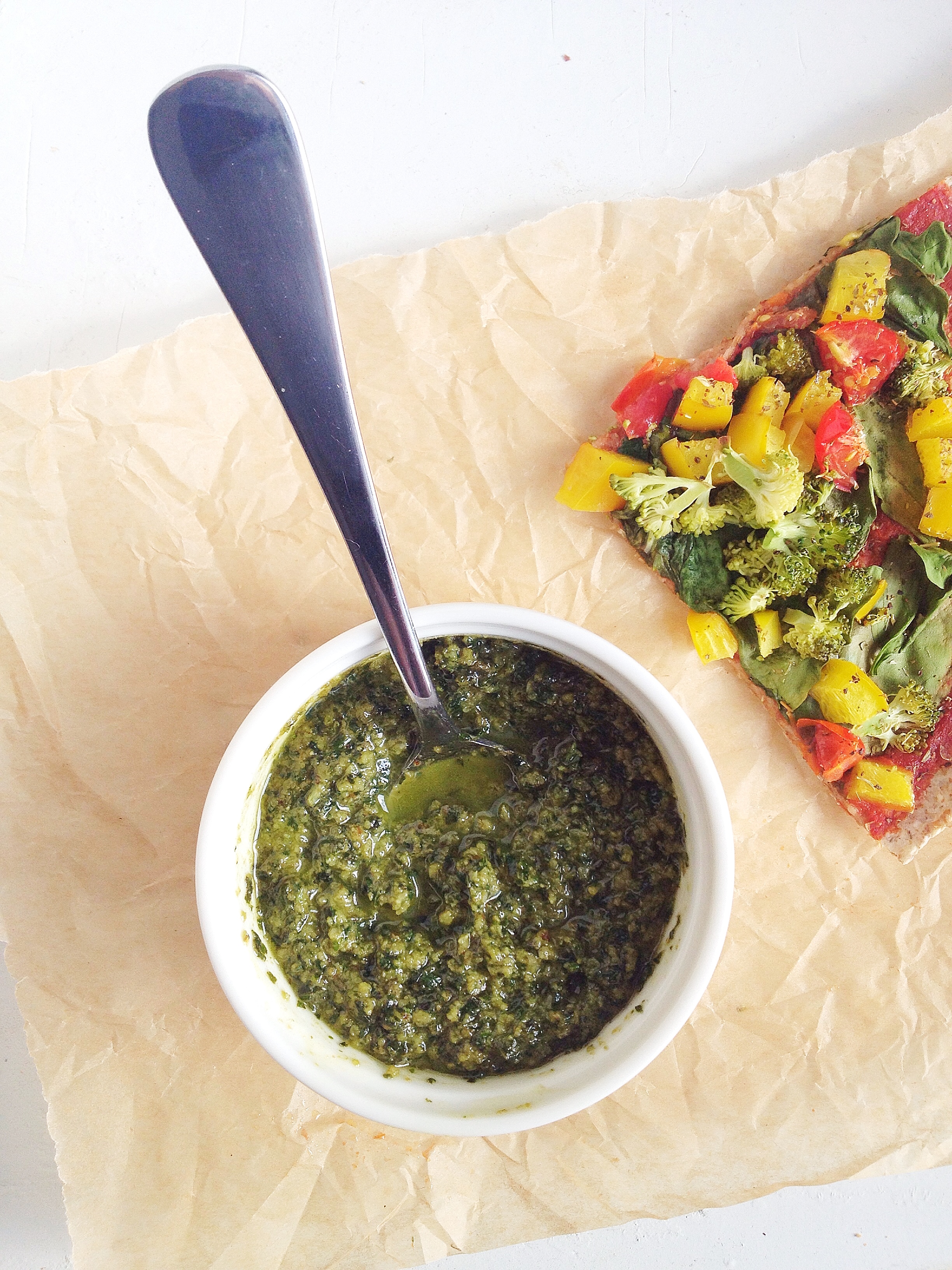 This vegan pesto packs a huge flavor punch and is dairy free. Enjoy it on homemade pizza, pasta, slathered on bread, or as topping for roasted veggies.