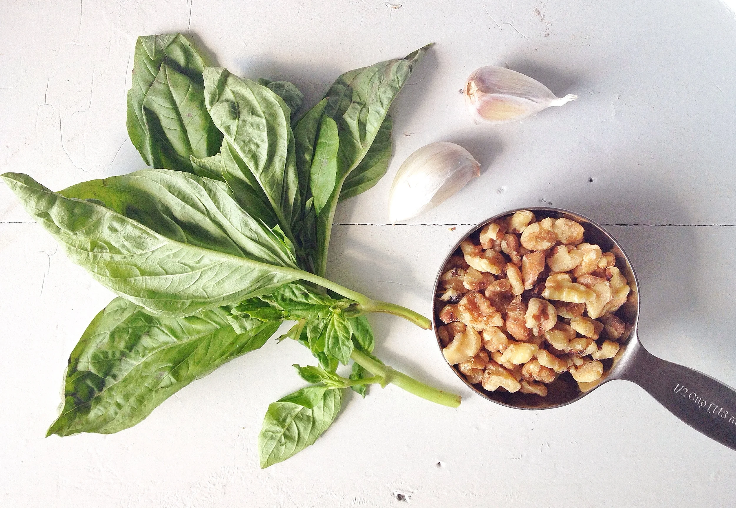If you have never tried making your own pesto, let this summer be your first. Head over to your local farmer's market and grab a big bag of fresh, local basil. Don't forget to stick your nose in it....heavenly! Traditional pesto is made with Parmesan cheese, but even if you eat cheese on the reg, give this dairy free pesto a try! Its packed with so much flavor that you won't even miss the parm. I promise! Pesto can be made from a variety of nuts such as pecans or hazelnuts - but I find that walnuts yield a flavor closest to traditional pesto made with pine nuts.