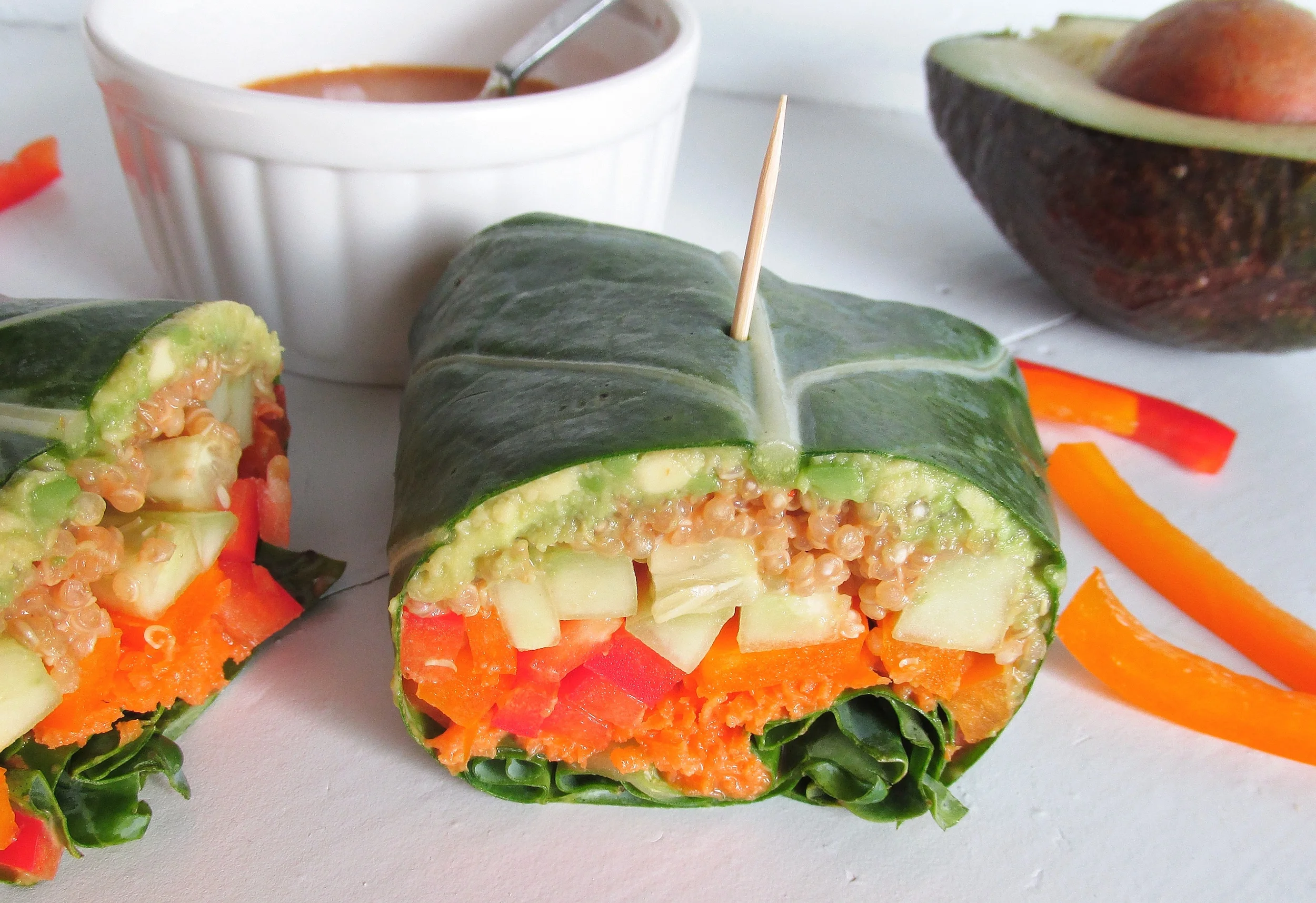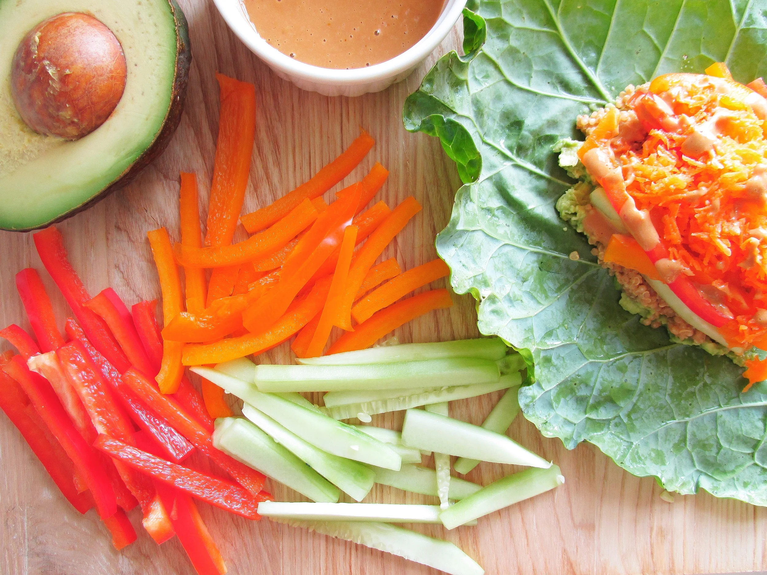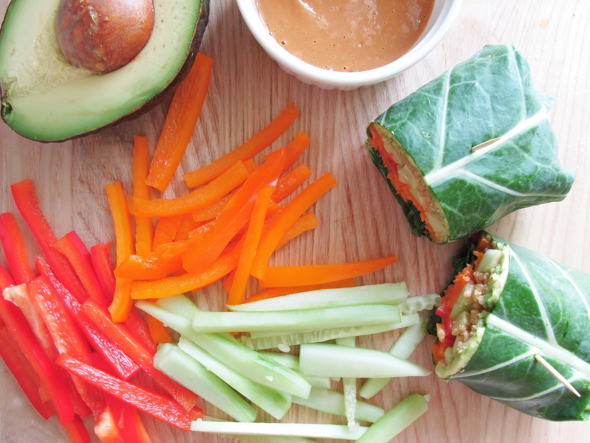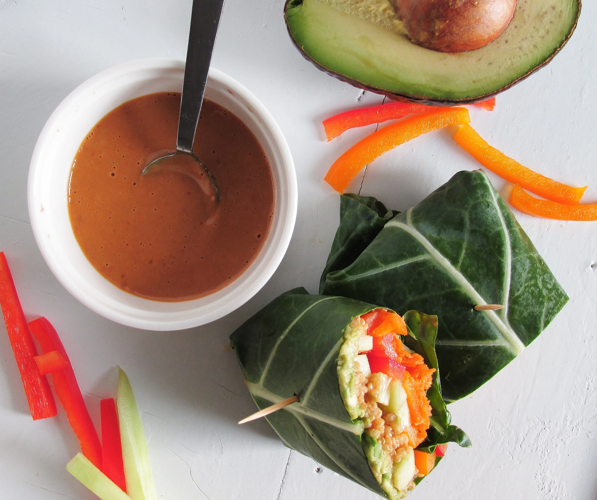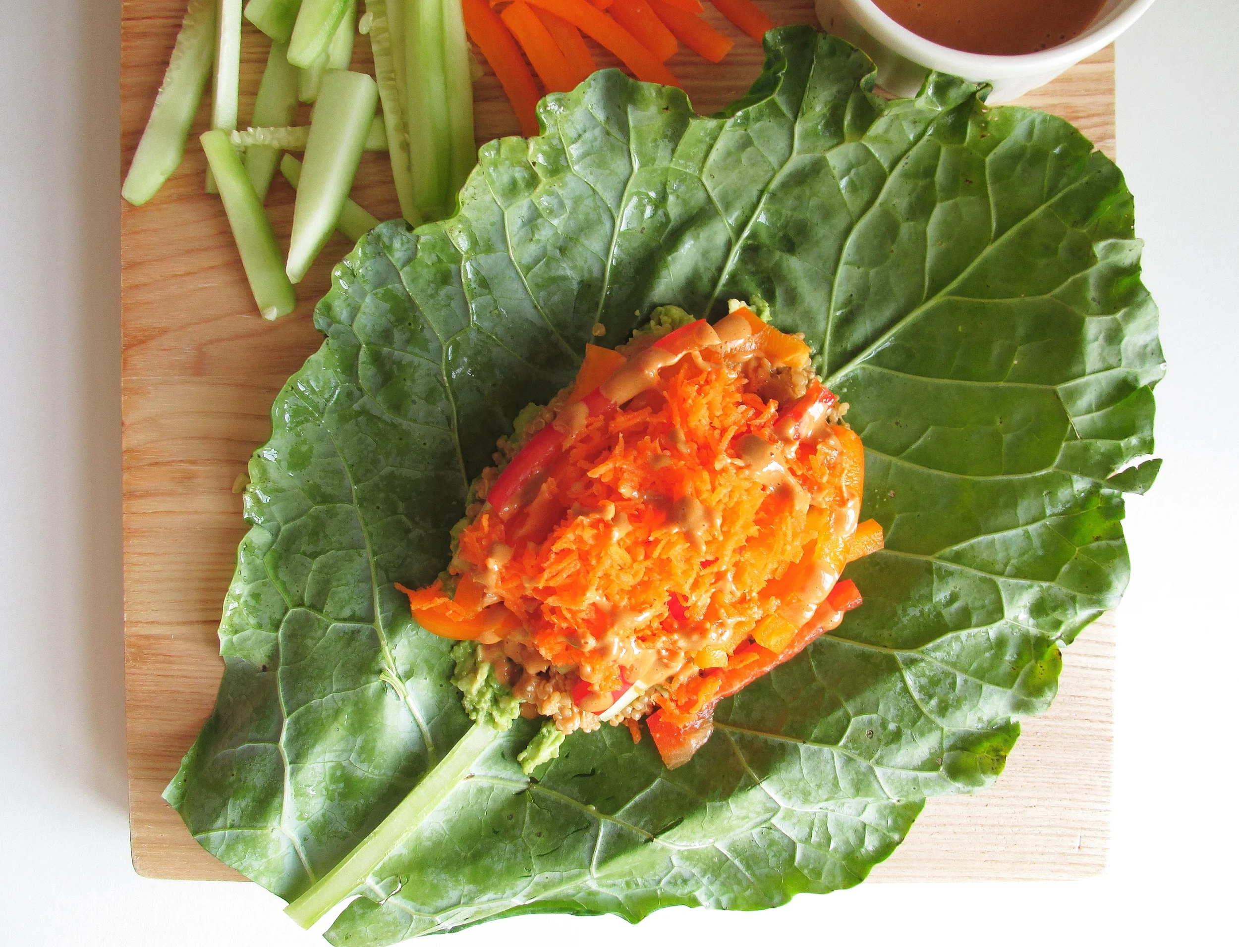 Collard Green Wraps with Rainbow Veggies & Peanut Sauce (V + GF)