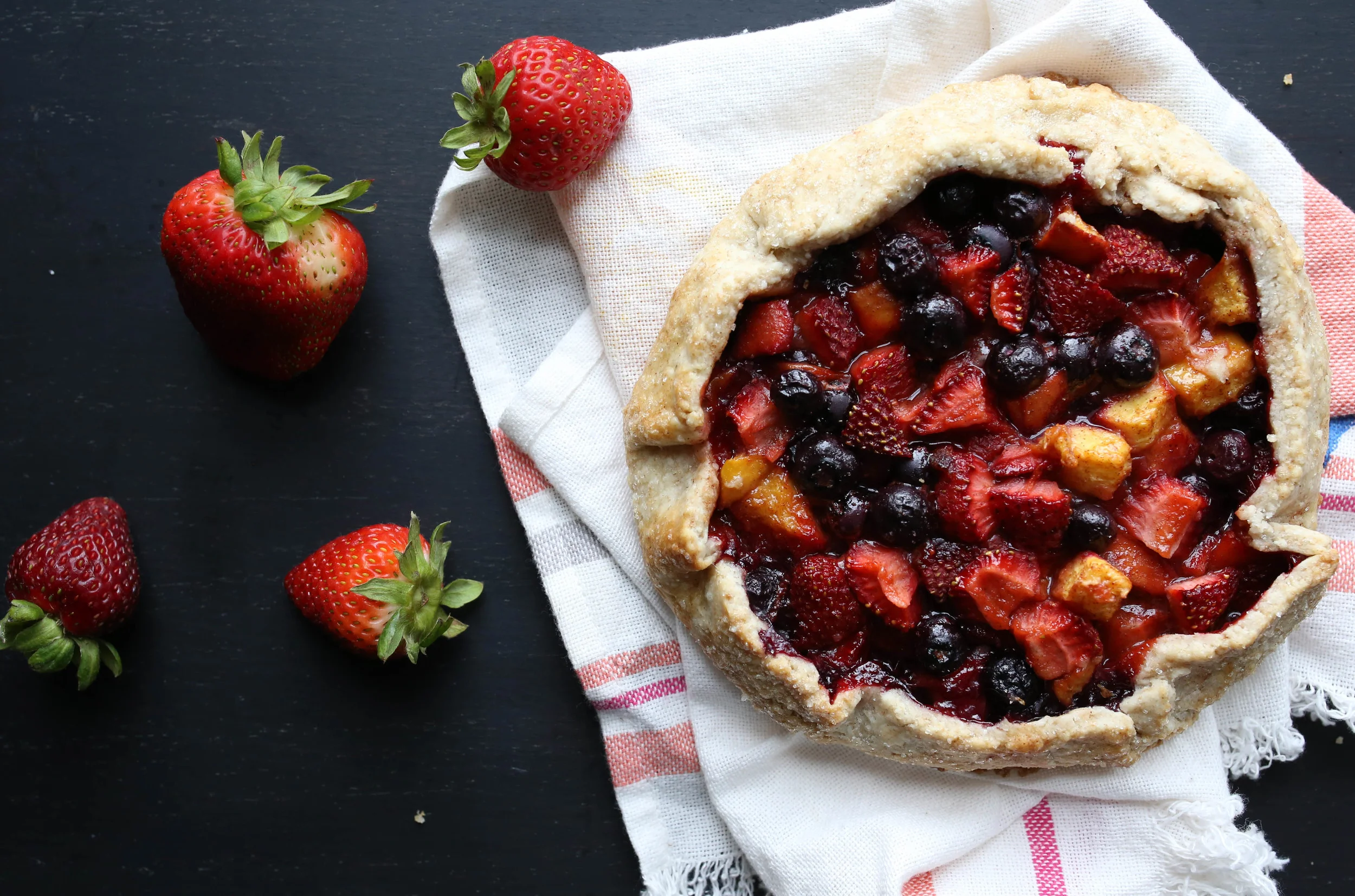Seriously you guys, this is so good. The crust is incredibly flaky and the middle is filled with delicious juicy fruit. I wanted to use summer fruits for this so I chose blueberries, strawberries, and a peach. I have been eating blueberries, strawberries, and peaches like it's my job lately so the combo seemed like a no-brainer.