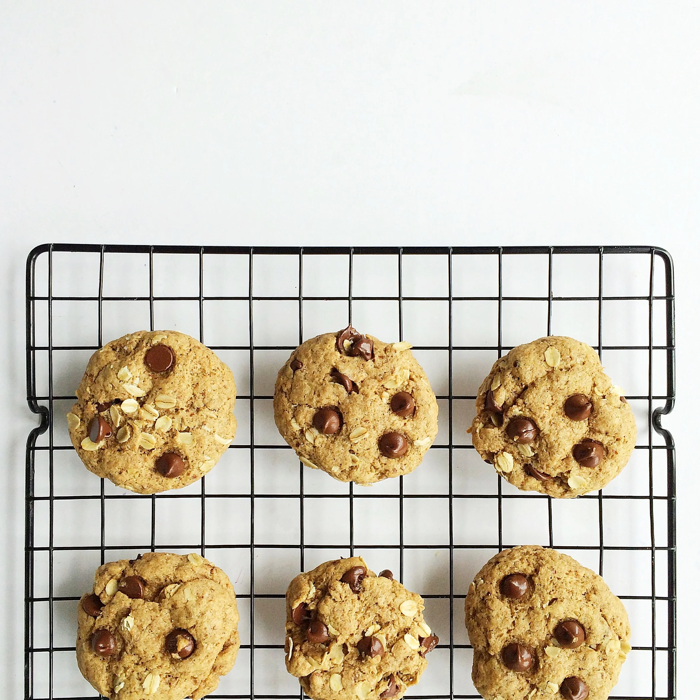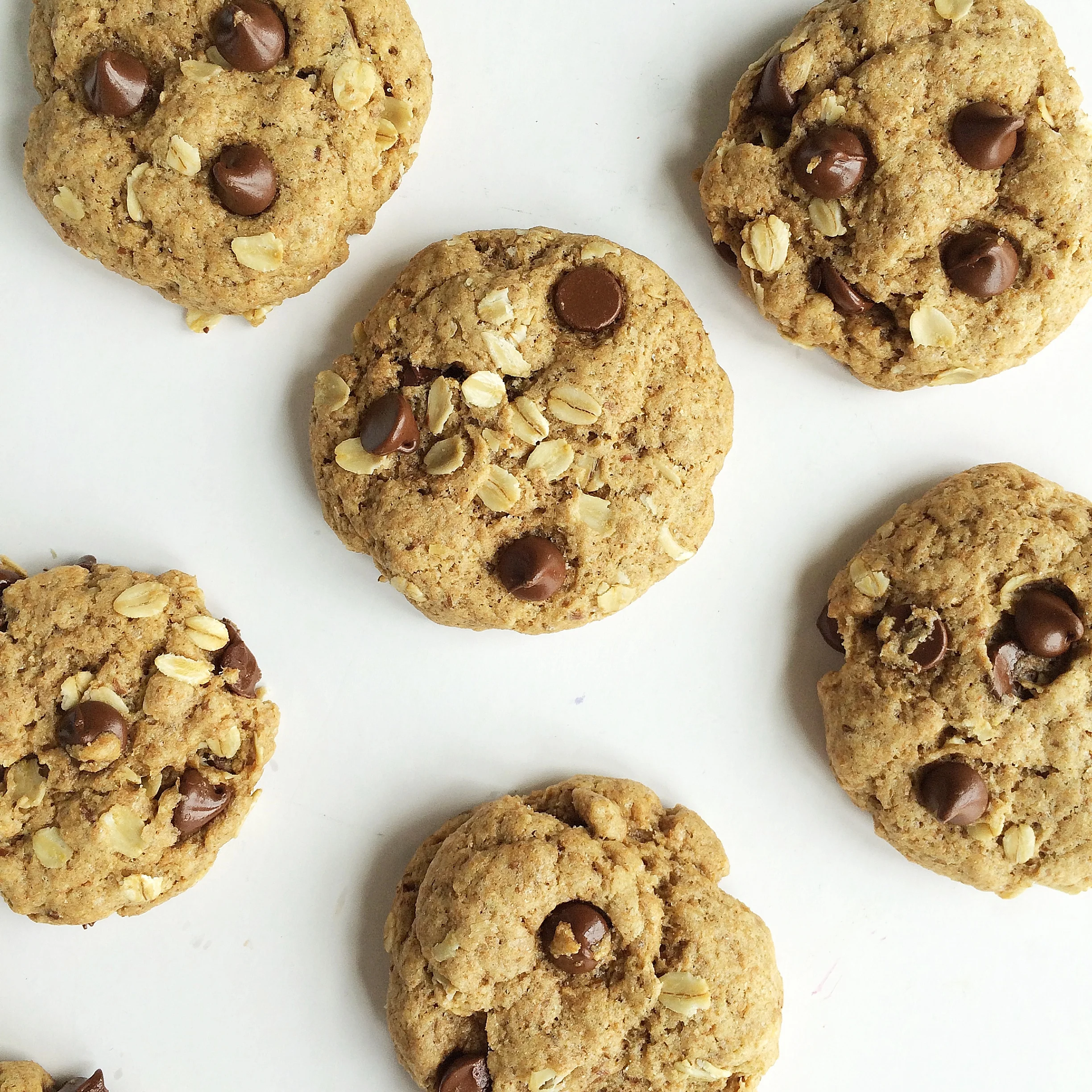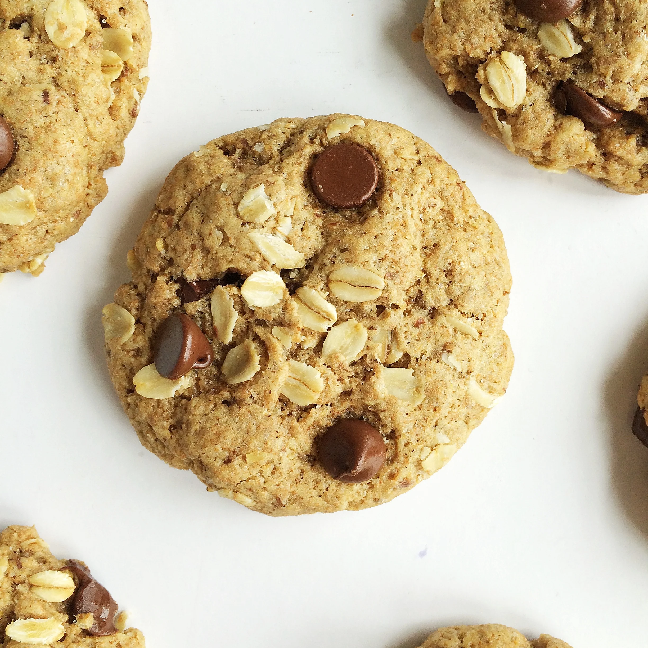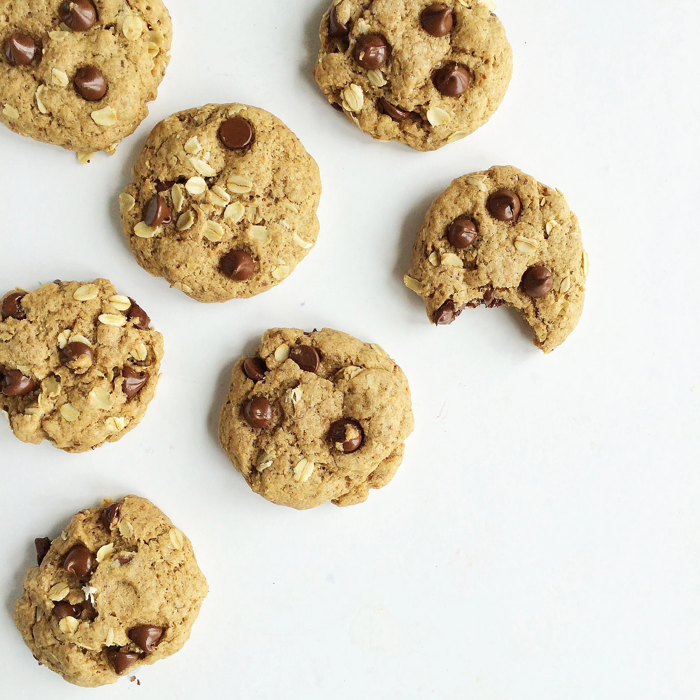 Traditional chocolate chip cookies are made with white flour, eggs, a lot of butter, and a lot of sugar. The health nerd in me had to switch things up a little (duh). I used whole wheat flour, a flax "egg" to hold everything together, coconut oil instead of butter, and cut back on the sugar. Oh, and I added some oats...because, why not?!